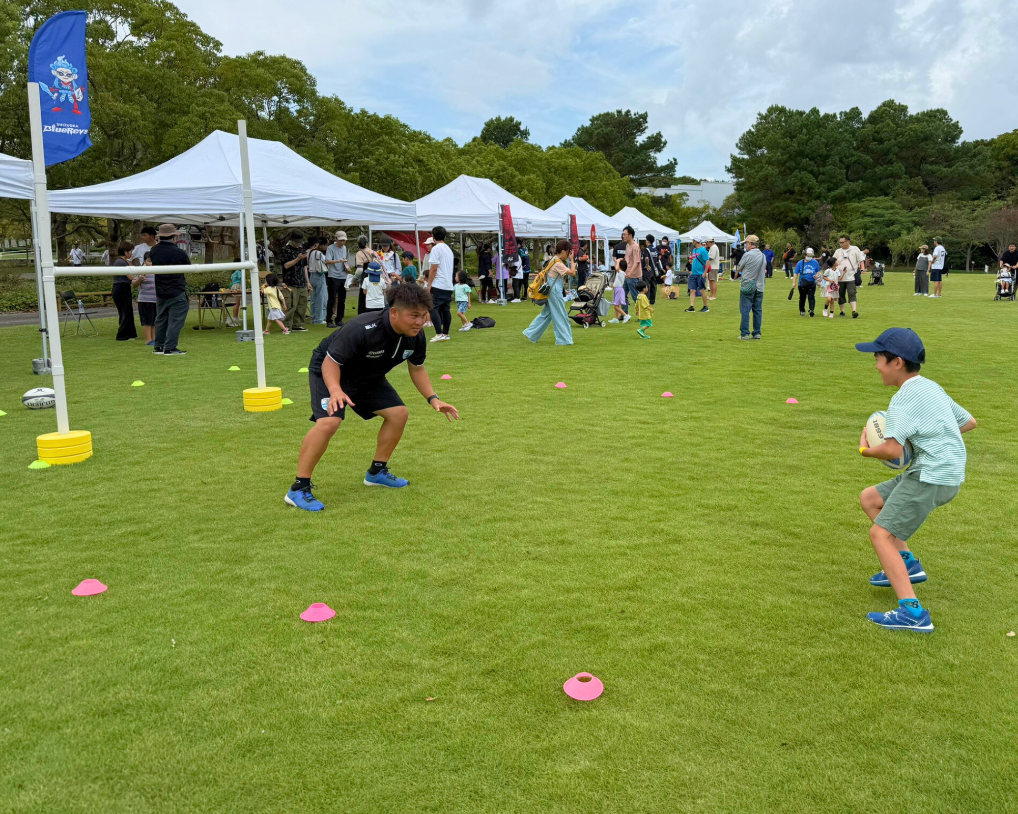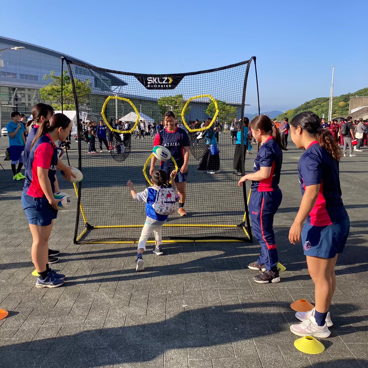 女子ラグビーチーム アザレア・セブンの選手たちがボールの持ち方・投げ方をやさしく教えてくれます!楕円の形をしたボールを狙った場所に投げられるか? パーフェクトを目指してLet’s チャレンジ!!